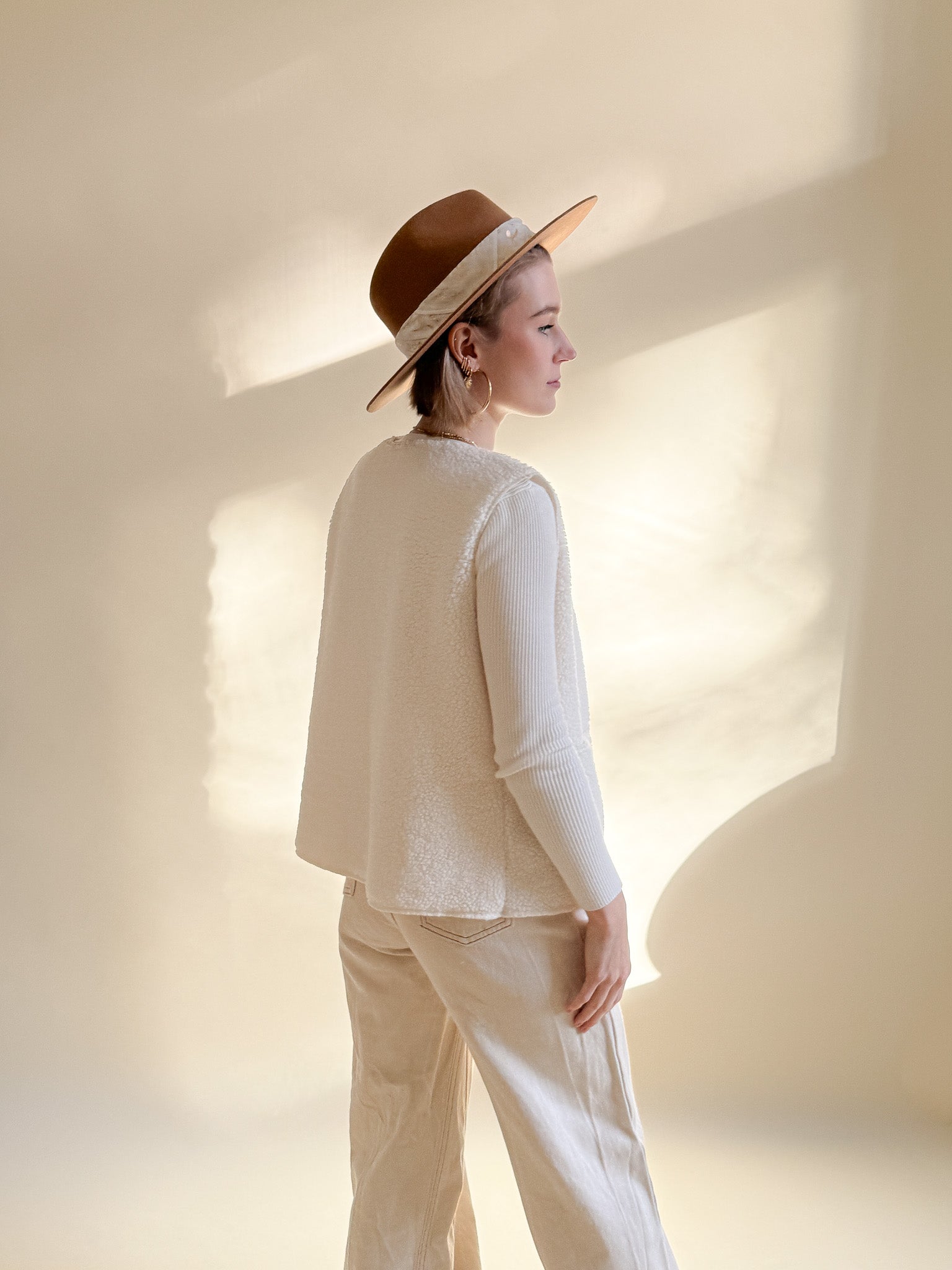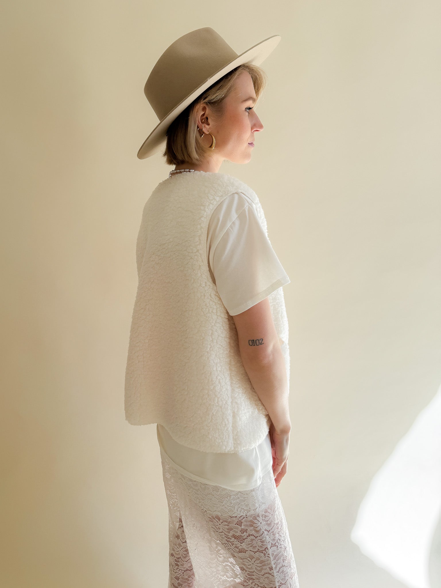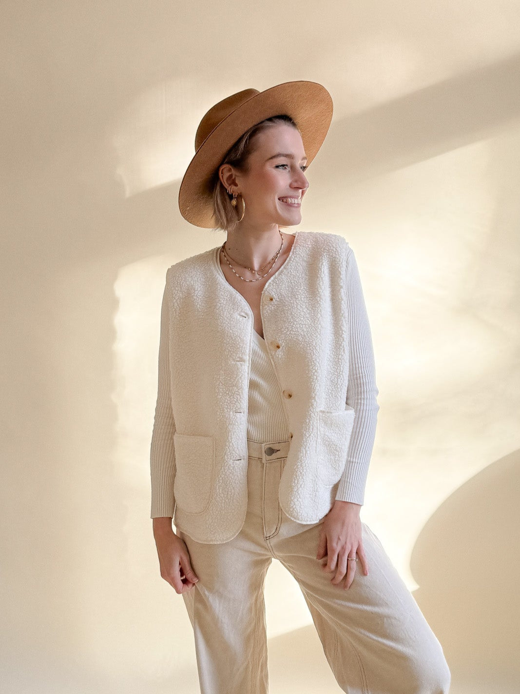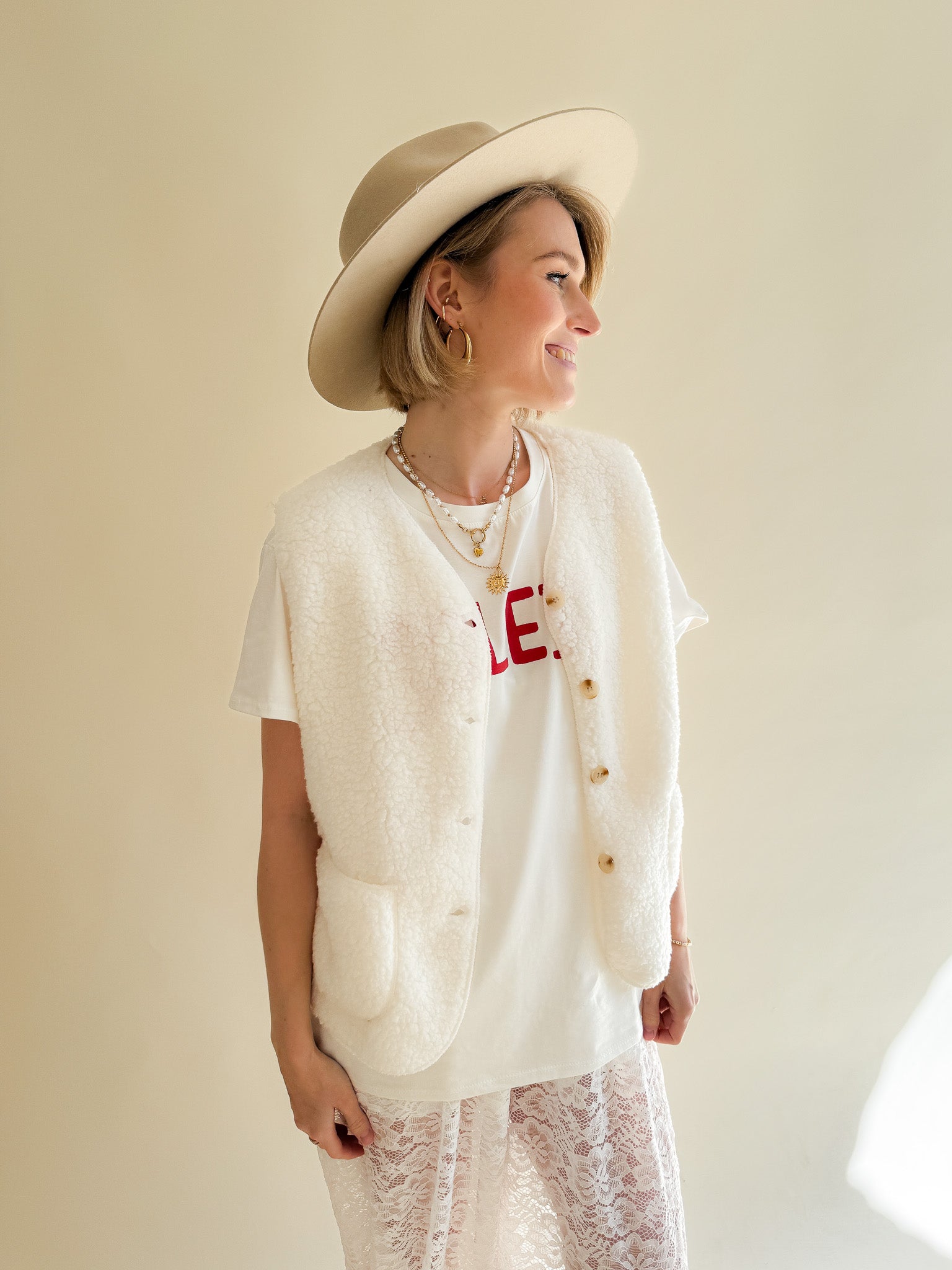 Super kuschelige Teddy Weste mit Knopfleiste und zwei Taschen. Die Passform ist locker und gerade geschnitten. Ideal für T-shirts, Langarmshirts oder als Kombination mit leichten Pullovern. Hergestellt in Italien.