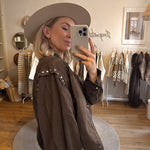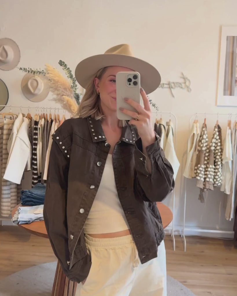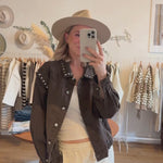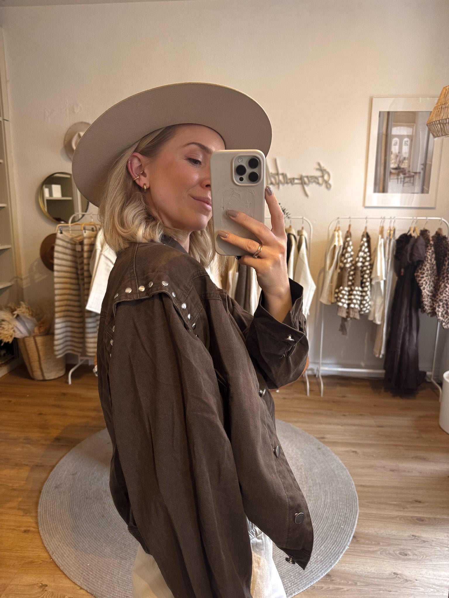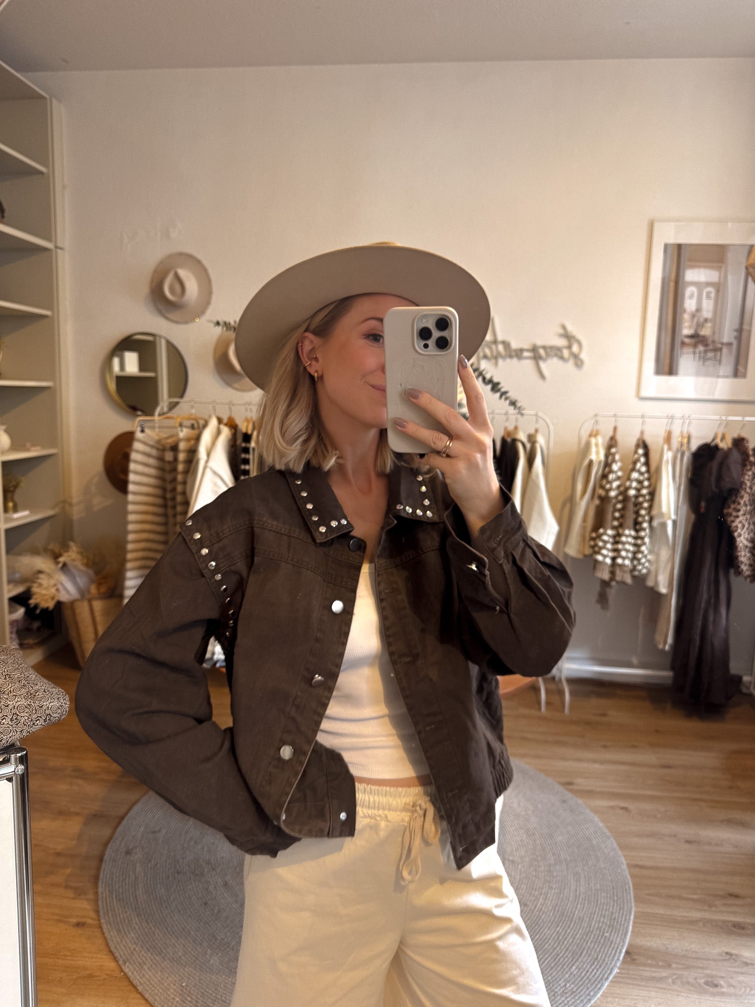 Jeansjacke mit überschnittenen Schultern und Nietenverzierungen.